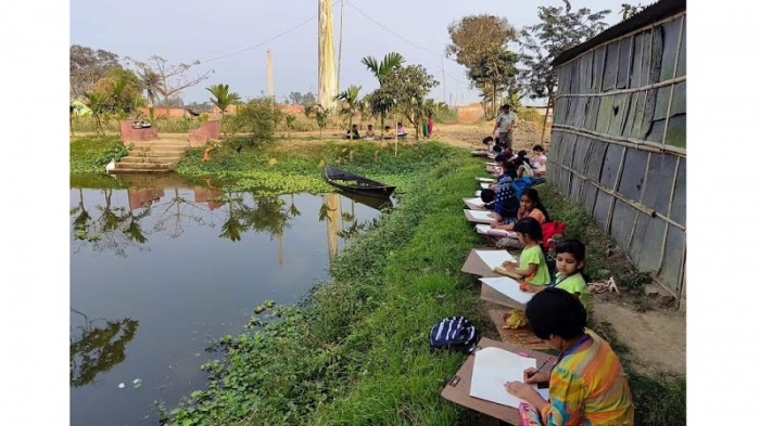 মনের আনন্দে প্রাকৃতিক দৃশ্য আঁকছে শিশুরা